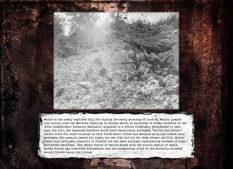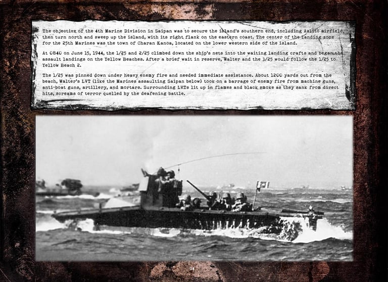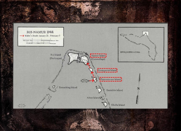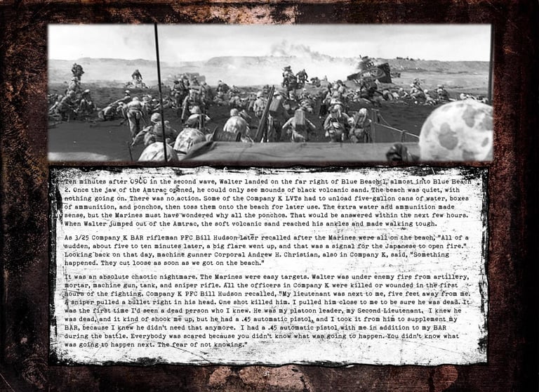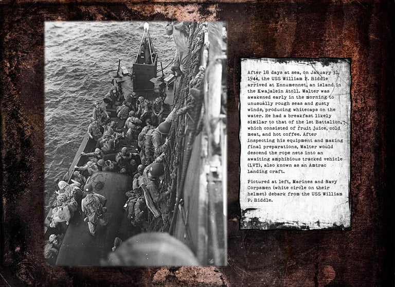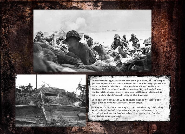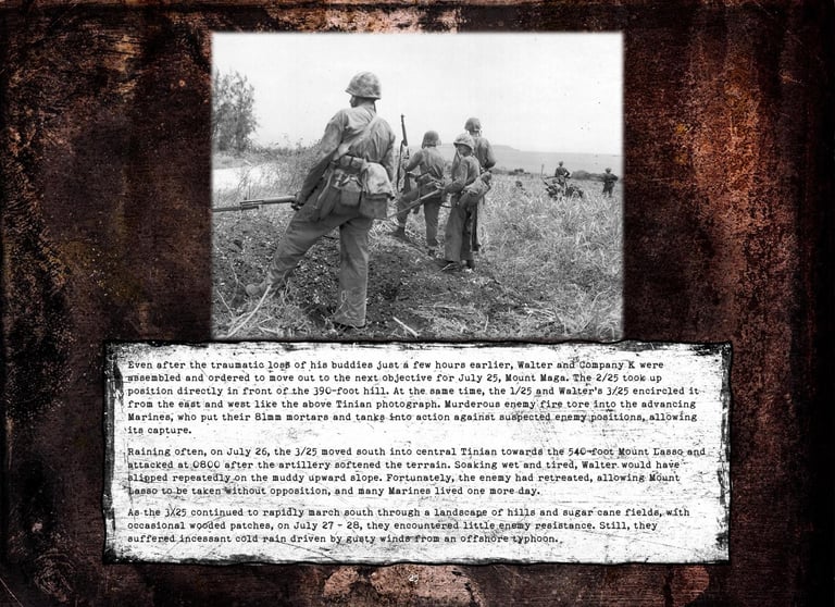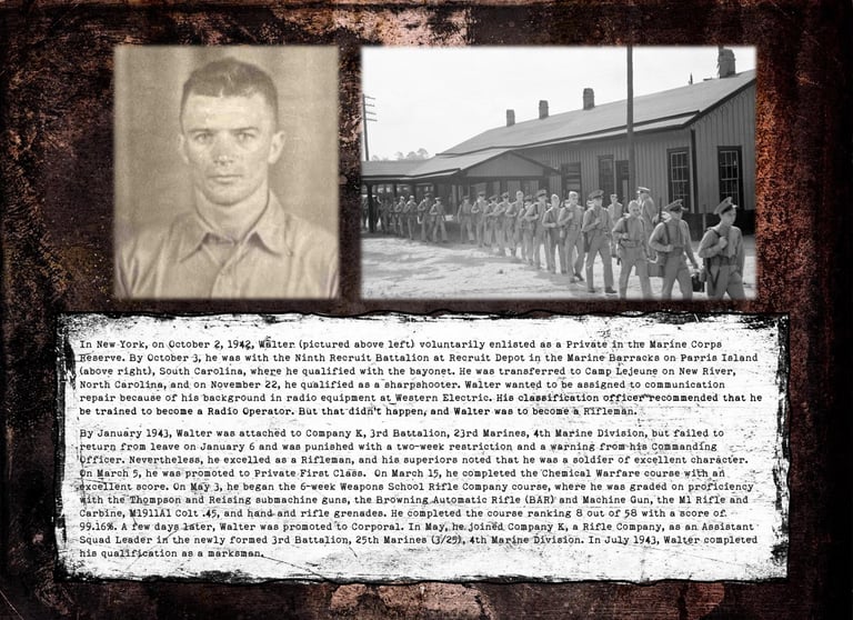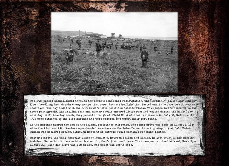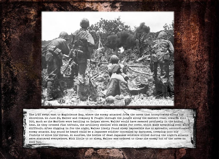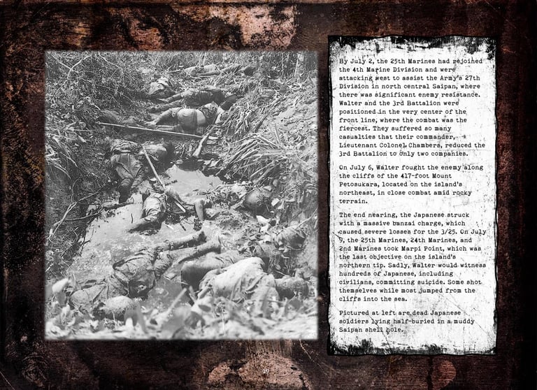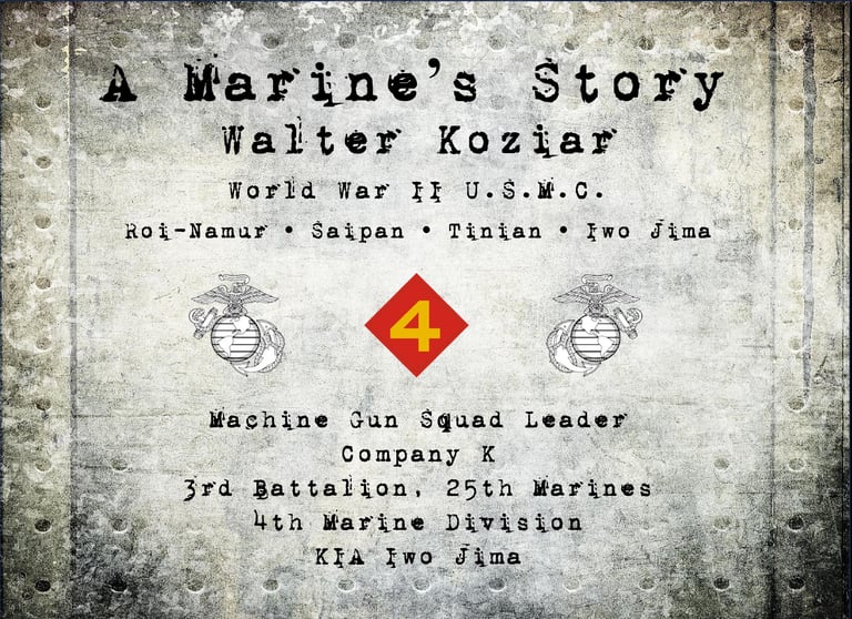 Walter was in Company "K", 3rd Battalion, 25th Marines, 4th Marine Division. He fought on Roi-Namur, Saipan, Tinian, and Iwo Jima.