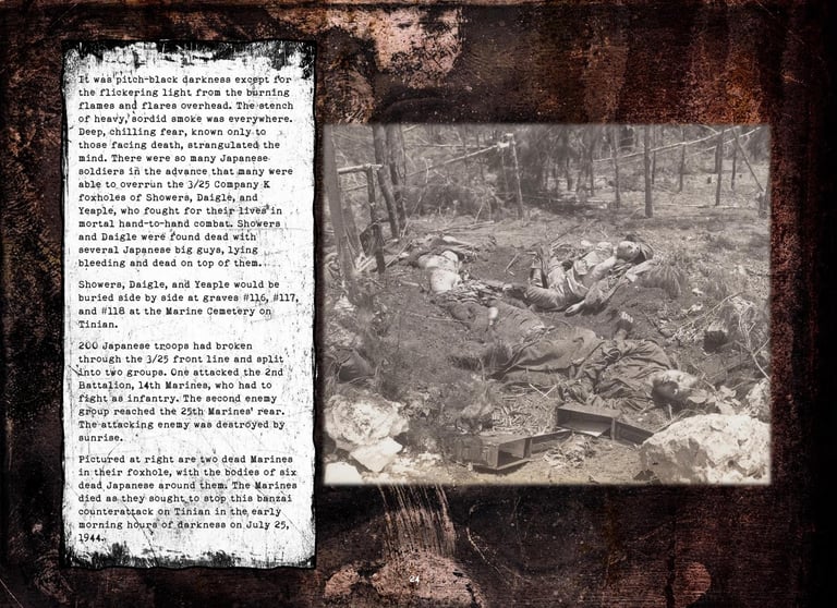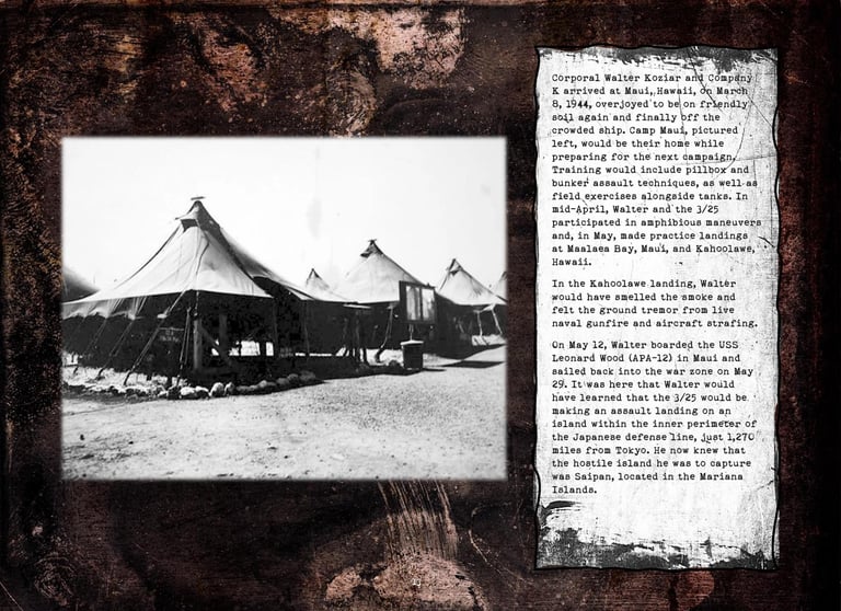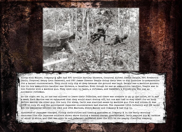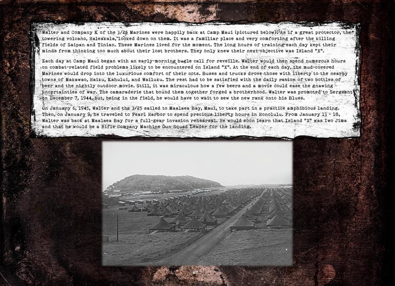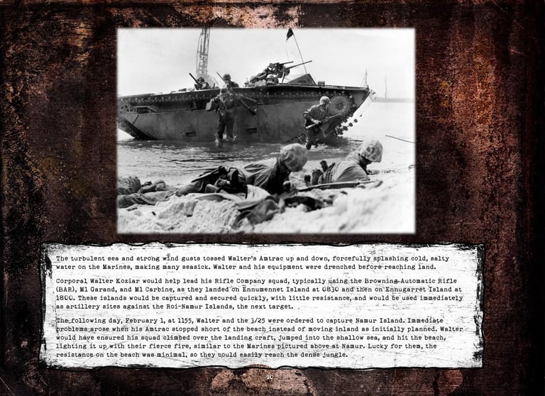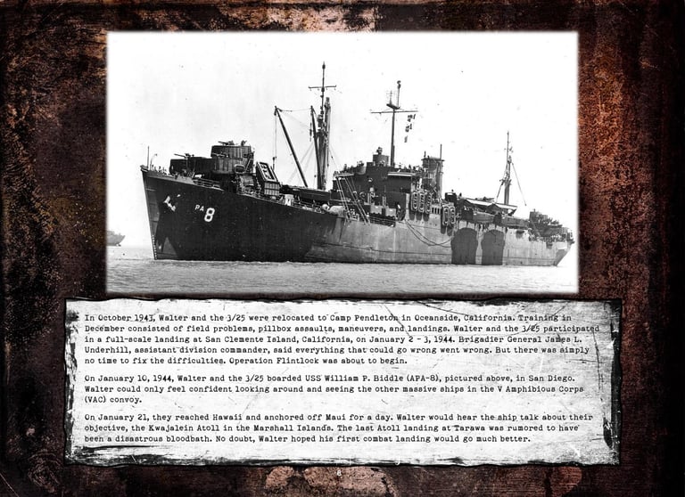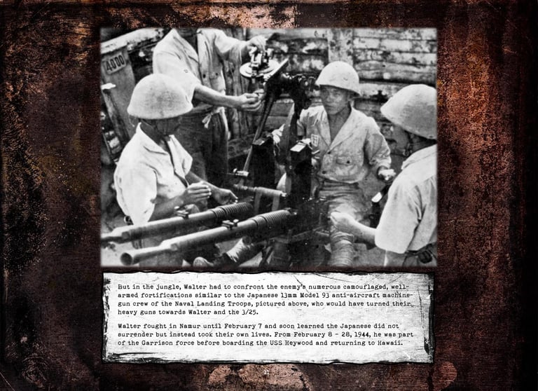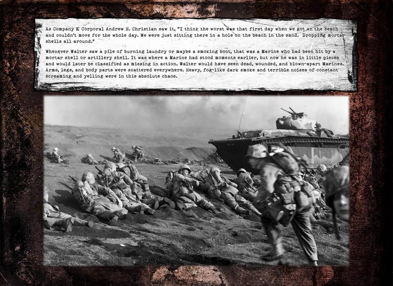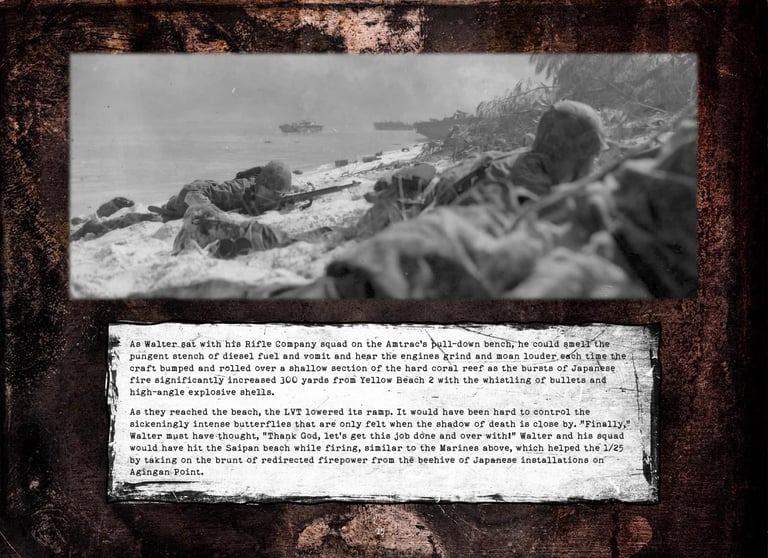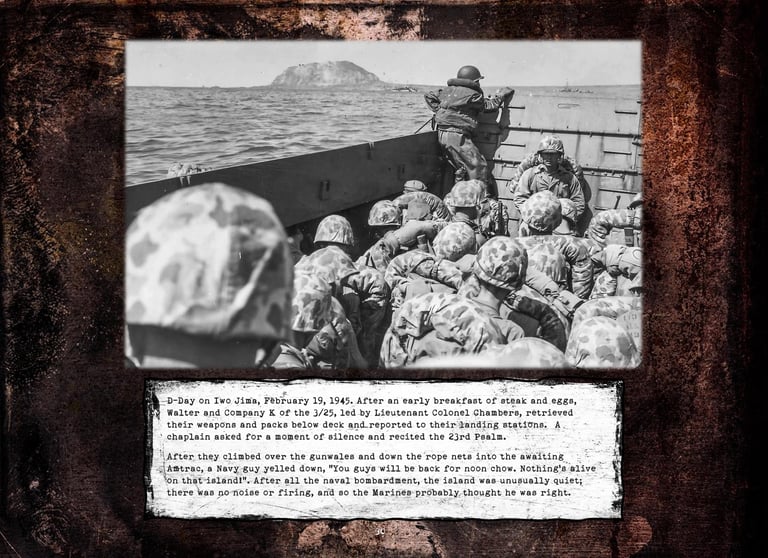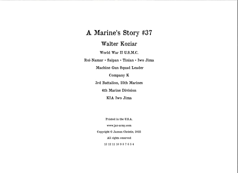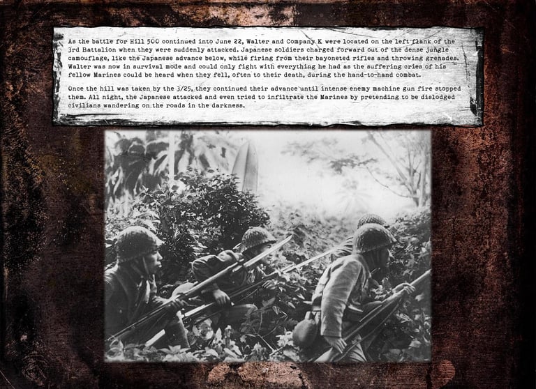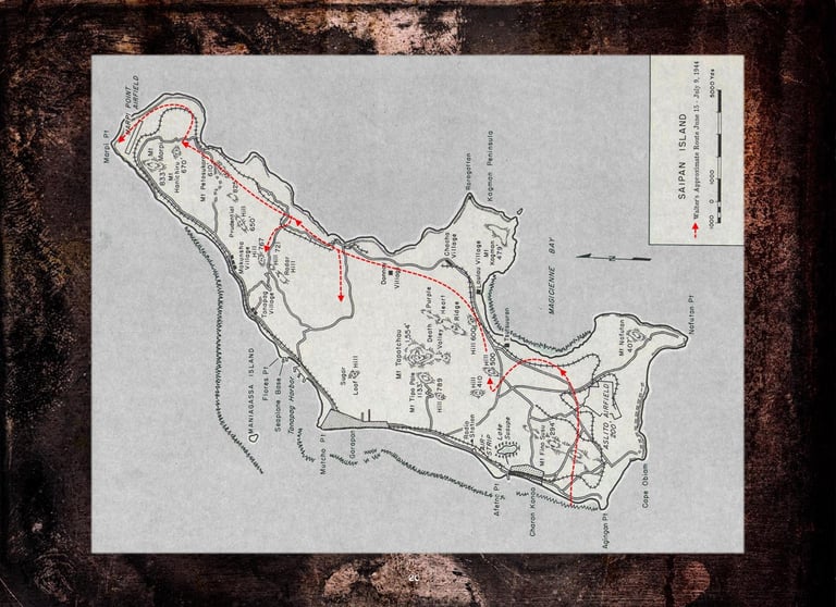 Walter was in Company "K", 3rd Battalion, 25th Marines, 4th Marine Division. He fought on Roi-Namur, Saipan, Tinian, and Iwo Jima.
