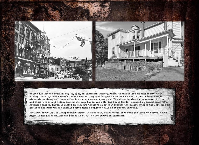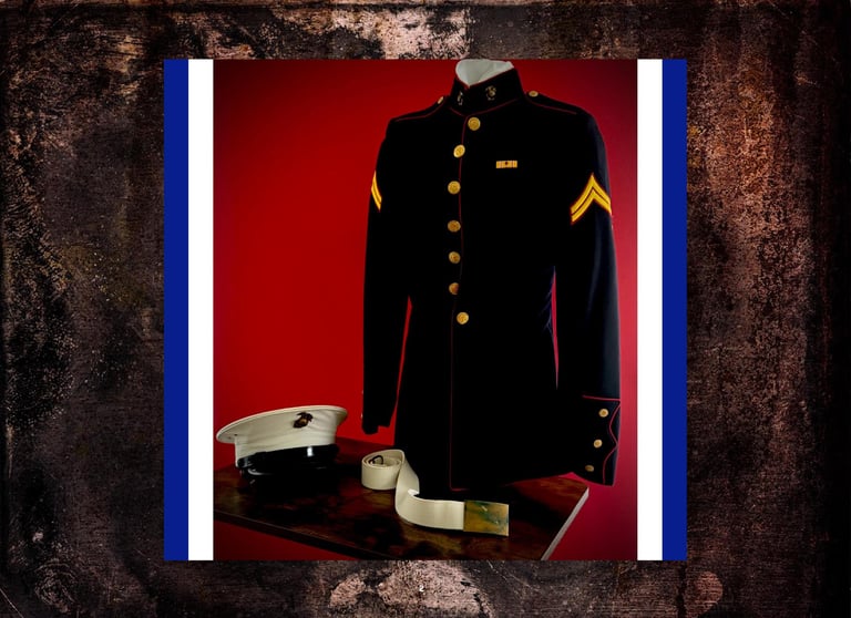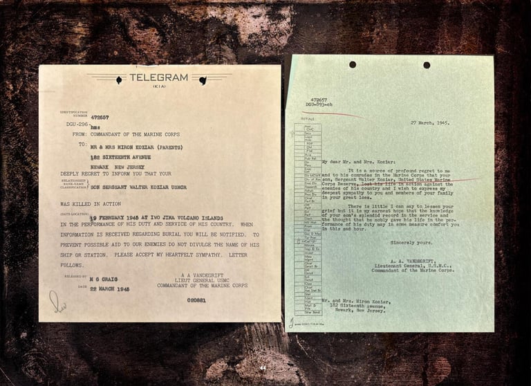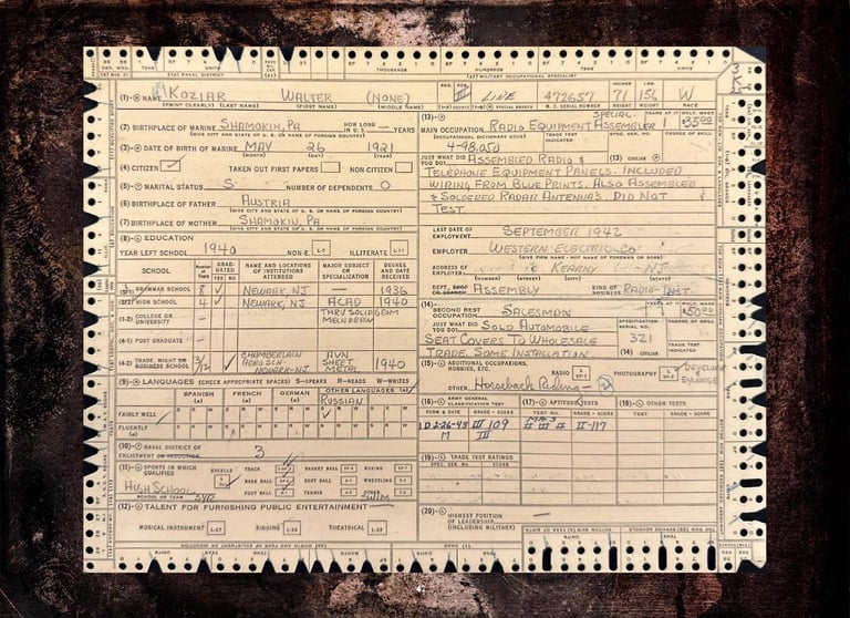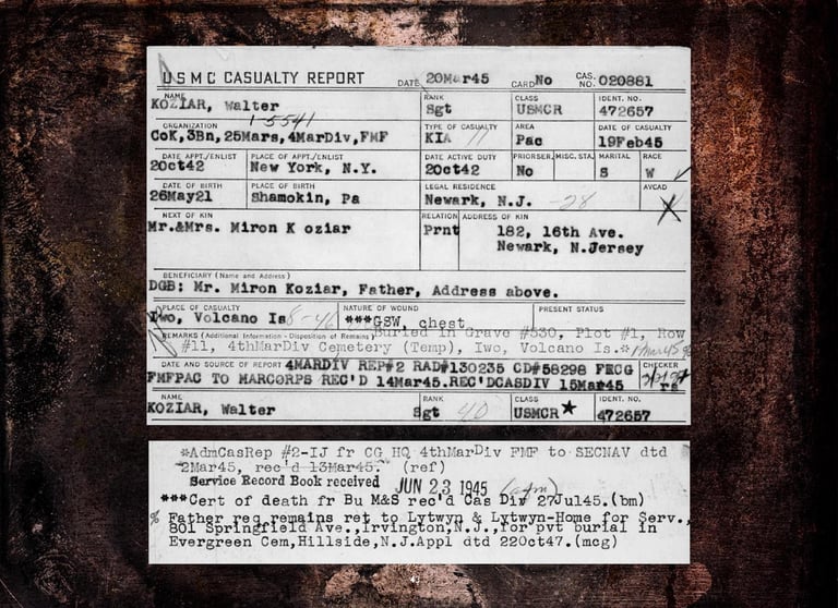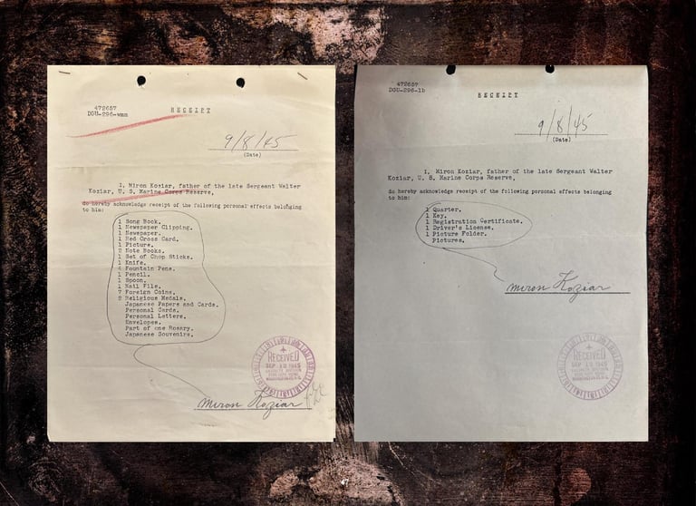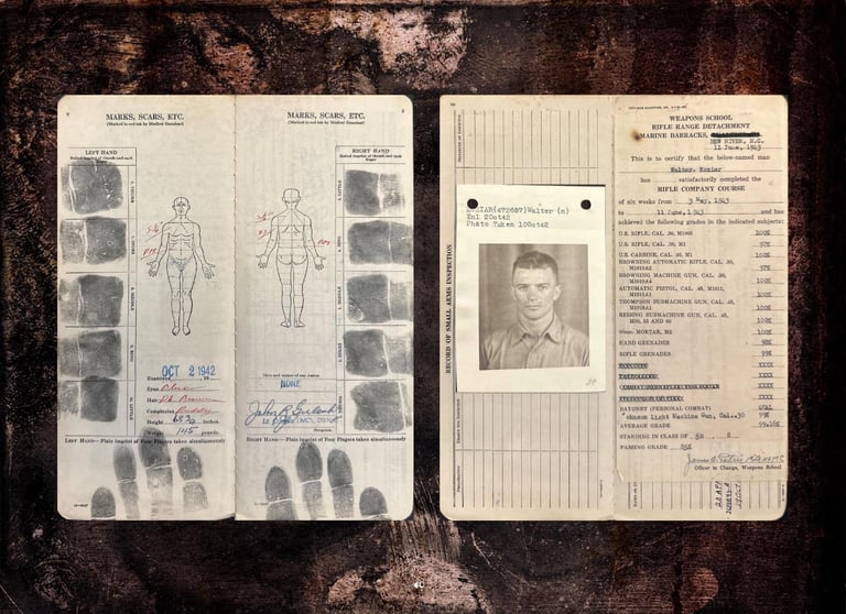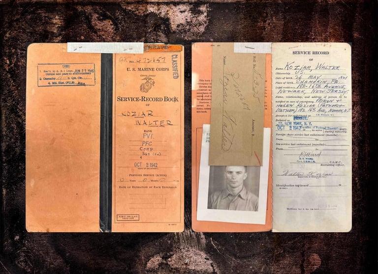 Included are Walter Koziar's Marine Corps WWII 1943 Dress Blues Coat, Cover, Belt & Hardcover (including his digitized Official Military Personnel File).