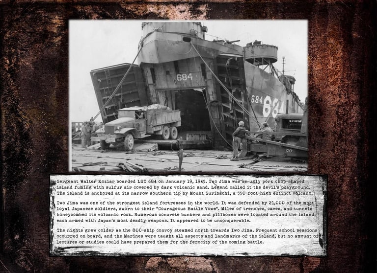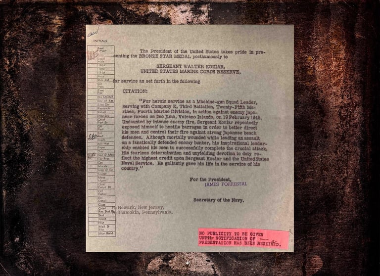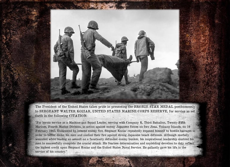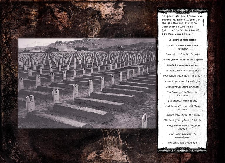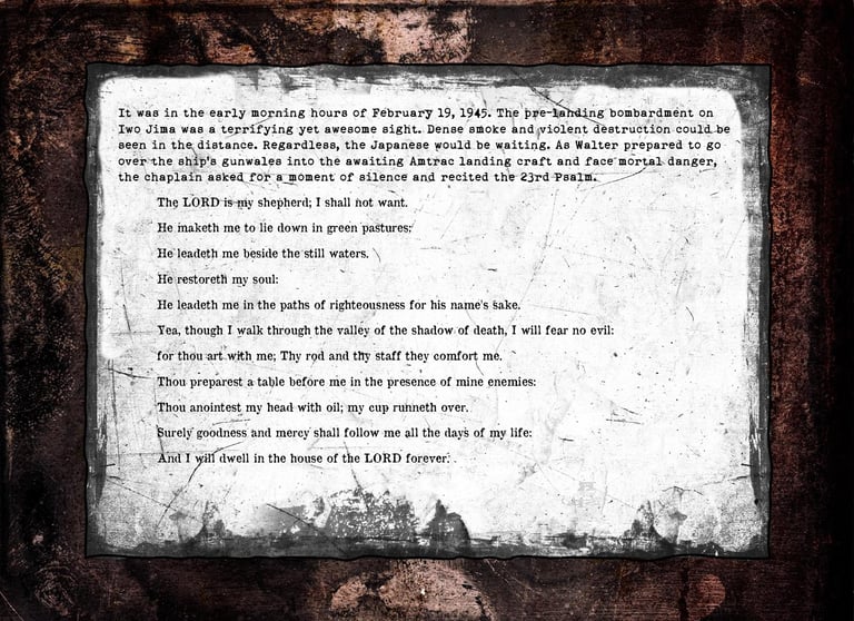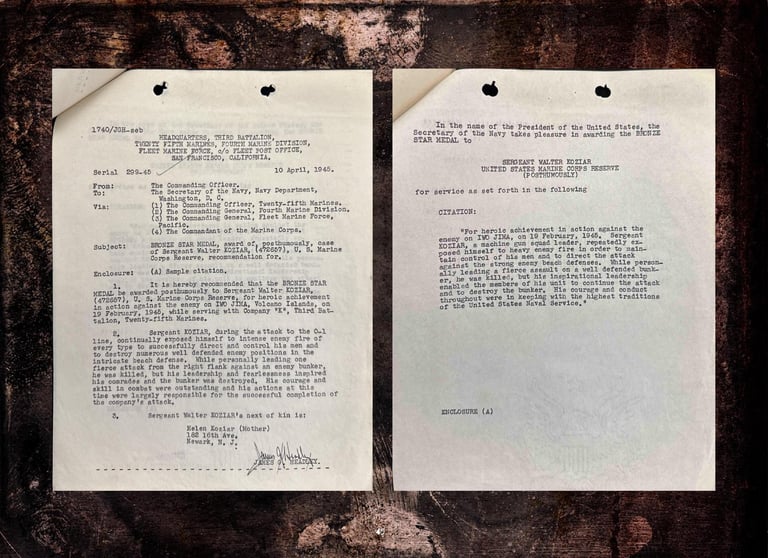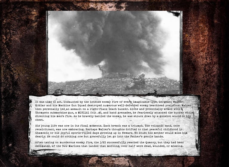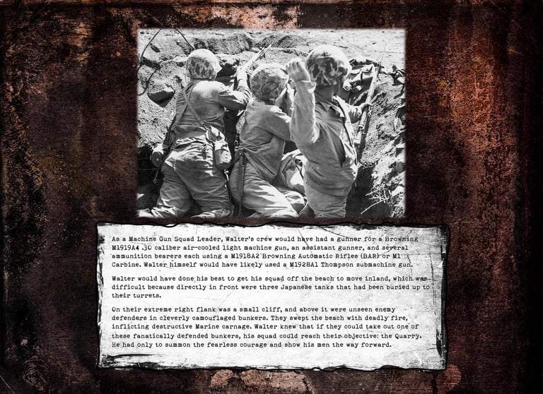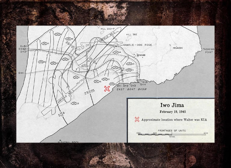 Walter was KIA while leading his men to take out a Japanese Iwo Jima beach pillbox during the first day’s second landing wave on February 19, 1945.