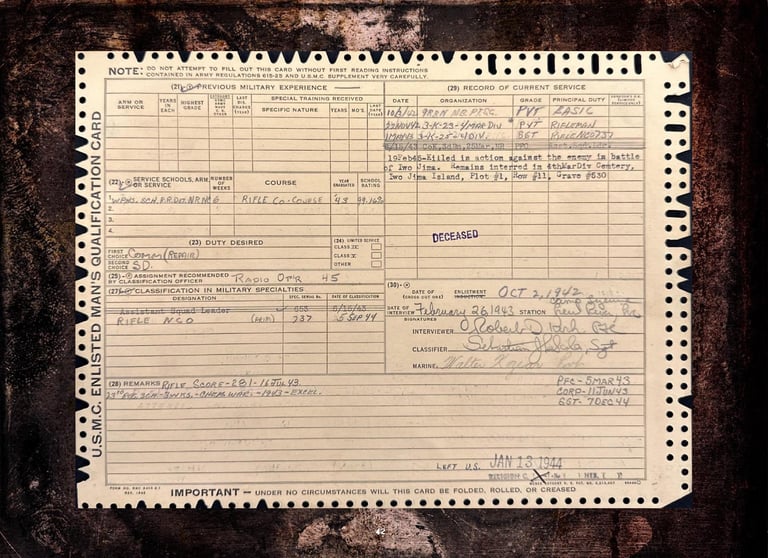 A 47-page Hardcover "A Marines's Story" (see pages below) honoring his life and World War II experiences along with his digitized Official Military Personnel File (OMPF) are included. The book is based on information from documented sources.